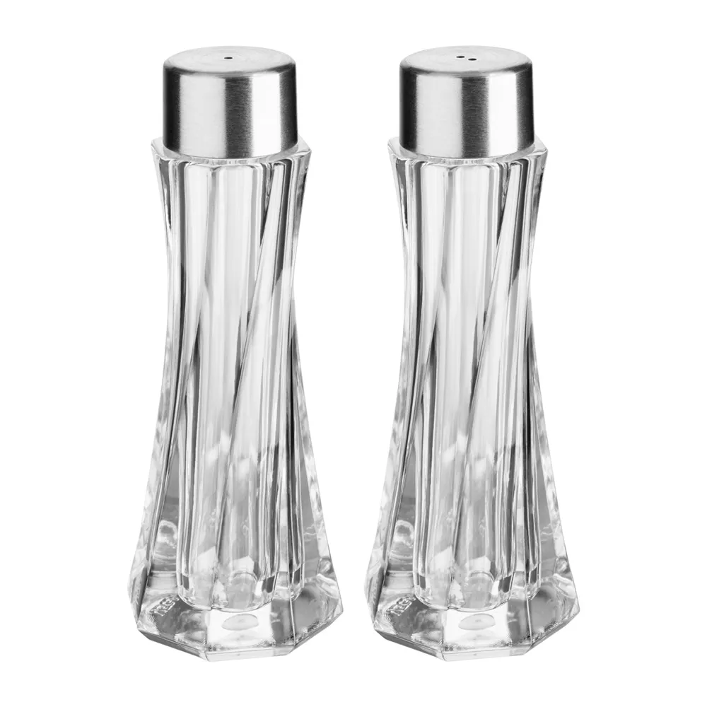 Ménagère salière et poivrière avec corps en verre pressé rainuré et bouchon en inox 18/0. Passe au lave-vaisselle.